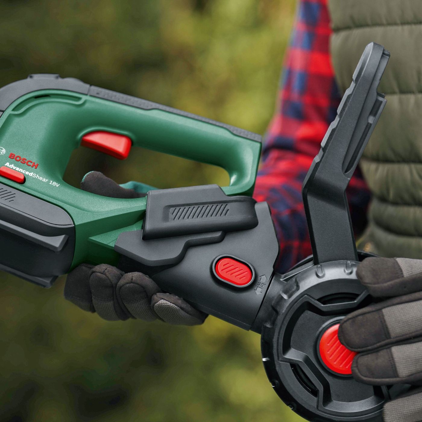 S produžnom šipkom AdvancedShear 18V-10, saginjanje i klečanje za košnju trave ili rezanje grmlja stvar su prošlosti. Ovaj podesivi produžni štap duljine do 115 cm osigurava visoku udobnost i preciznost zahvaljujući raznim dizajnerskim značajkama. Za optimalnu udobnost, šipka se može rotirati 90° lijevo ili desno. To ga čini idealnim za precizno obrezivanje rubova travnjaka ili cvjetnjaka. Pri radu na teško dostupnim mjestima, poput visećeg raslinja ili brige o malim živicama, glava šipke može se potpuno podesiti do 130 stupnjeva za izuzetno svestranu primjenu. Rotiranje u 15 različitih položaja. Svojim jednostavnim dizajnom u 3 stupnja, ovaj bežični pribor idealan je pomagač za savršenu njegu vrta.