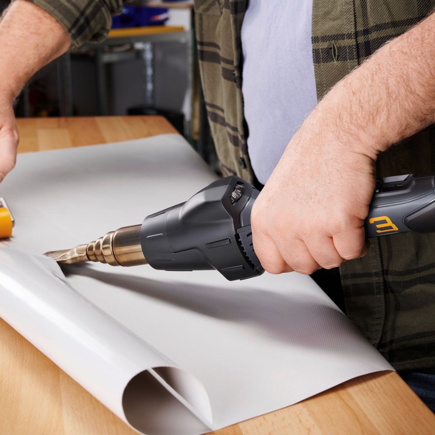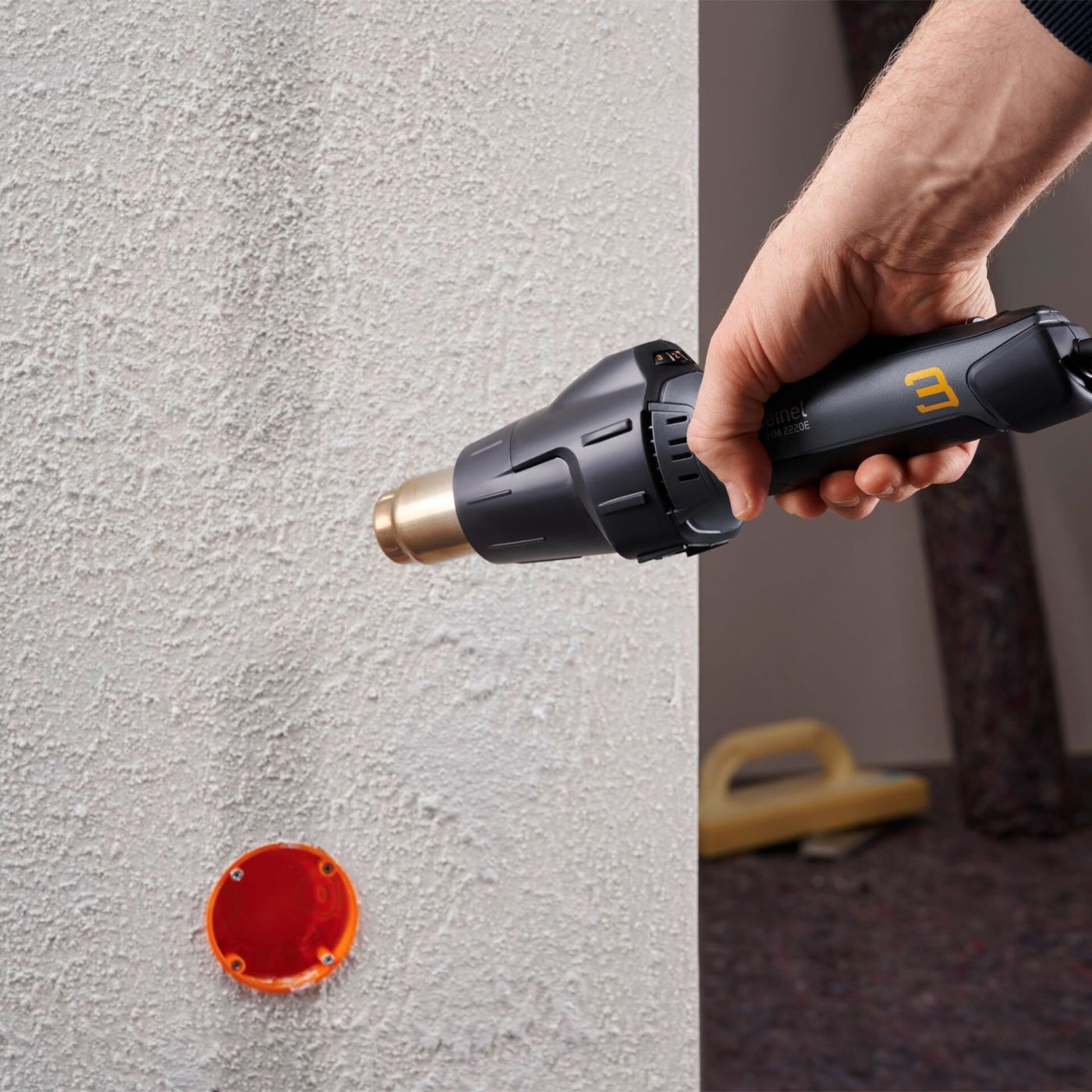 Elektronički upravljani puhač vrućeg zraka HM 2220 E s 2200 W, kontinuirano podešavanje temperature od 80 - 630°C u 9 stupnjeva pomoću kotačića za podešavanje i regulacija količine zraka u 2 stupnja od 150 l/min do 500 l/min, lagan 610 g za ambiciozne DIY projekte gdje je potrebna puna snaga,